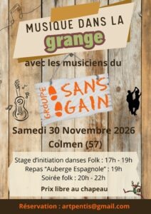 Marie et Laurent ont aménagé leur grange pour en faire un espace de partage autour des arts en tout genre : musique, danse, théâtre… Pour ce Samedi 30 Mai, ils nous ont proposé de venir animer un petit atelier folk suivie d’un repas sous forme d’auberge espagnole et une soirée festive avec quelques musiciens du groupe. En effet, seuls quelques musiciens du groupe Sans Gain animeront cette soirée qui n’en sera pas moins riche de danses et de musiques, et vous permettra de délier vos jambes et lever le coude ! Le lieu est conviviale mais petit, aussi les places sont limités et les réservations conseillées. Plus d’information à venir prochainement.
