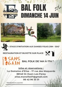 Le Domaine d’Elise, proche de Vittel et Contrexéville, vous propose chambres et tables d’hôtes dans un cadre bucolique, champêtre et agréable. Parfois, vous pouvez y apprécier quelques concerts et cette année, le dimanche 14 Juin, vous pourrez y danser sur les musiques du Groupe Sans Gain. N’hésitez pas à y réserver une chambre ou une merveilleuse suite pour la nuit précédente, vous serez sans aucun doute conquis par le savant mélange de styles XIXe et Contemporain. Le dimanche matin, de 10h à 12h, un stage de danse Folklorique (pour débutant) sera proposé par Gaëlle et Joëlle. Vous pourrez ensuite vous restaurer sur place avant de profiter d’un bal folk animé par le Groupe Sans Gain dans le charmant jardin du domaine, de 14h à 17h. Attention, les réservations pour le stage sont obligatoires (10euros) et fortement conseillées pour le bal. Pour plus d’informations, contactez directement Elise à l’adresse suivante : elise.mansilla57@gmail.com